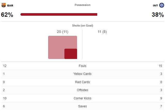 อินเตอร์น่าได้ประตูขึ้นนำจากจังหวะที่ชัลฮาโนกลูเปิดฟรีคิกจากทางริมเส้นฝั่งขวาไปหน้าประตูแล้วเป็นเชโก้ที่ทิ้งตัวชาร์จจ่อๆ แต่บอลพุ่งไปชนคานก่อนที่ฝั่งบาร์ซ่าจะช่วยกันเคลียร์ออกไปได้