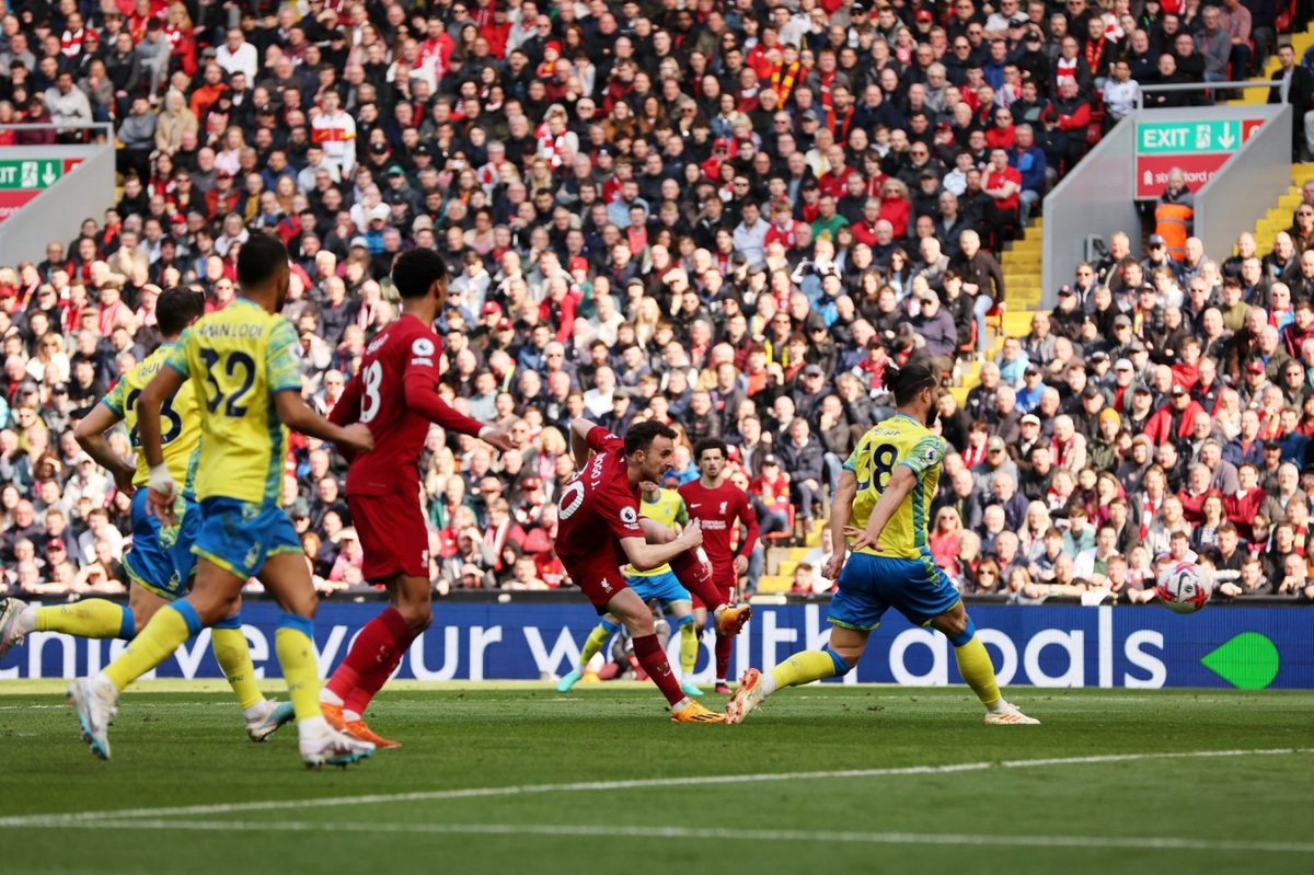 ฟรีคิกทางขวาของลิเวอร์พูลอีกครั้ง เทรนท์ วางยาวไปทางเสาสองเหมือนเดิมคราวนี้โชต้า โถมมาโขกระยะใกล้แต่ก็เข้าแค่หน้าต่างเท่านั้น