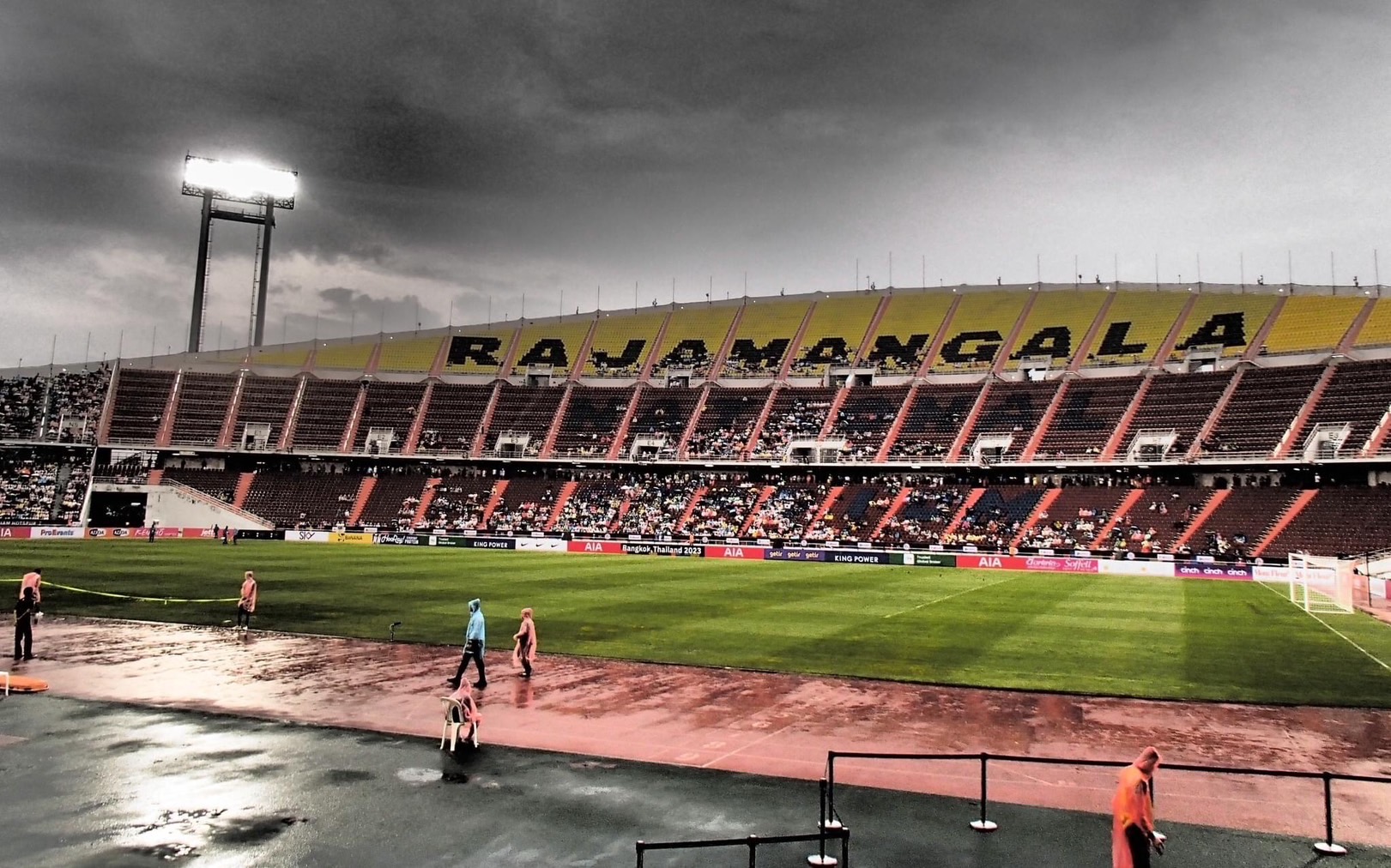 ประเด็นคือก่อนเตะไม่เห็นทำอะไรเลย คนมารีดน้ำสนาม 10 กว่าคน กับไม้ม๊อบ และ โต๊ะ เป็นผมผมก็ไม่รอนะ กว่าจะรีดน้ำเสร็จเตะได้คงจะ 4 ทุ่มไม่ก็เที่ยงคืน