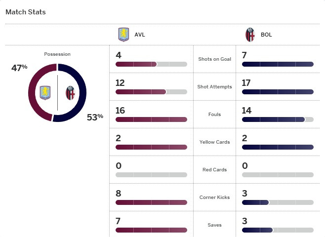 ท้ายครึ่ง โบโลญญ่าบุกได้น้ำได้เนื้อ กดดันวิลล่าต่อเนื่อง แต่ไม่เด็ดขาดพอได้จบสกอร์ตีเสมอ
