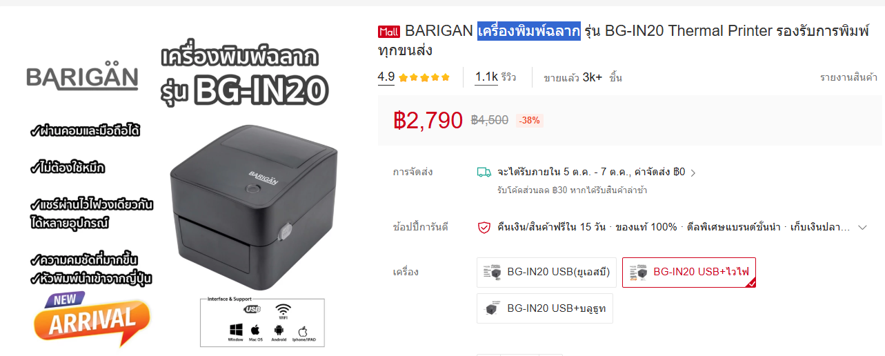 ขาย เครื่องปริ้นใบปะหน้า Barigan bg-in20 มือ 1 ในซีล ราคาถูกกว่า shopee เกินครึ่ง