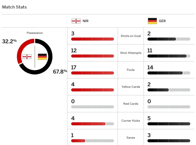อย่างไรก็ตาม ไอร์แลนด์เหนือส่งสัญญาณเตือนเยอรมนีว่าประมาทพวกเขาไม่ได้ หลังบัลลาร์ดส่งบอลตุงตาข่ายสำเร็จ ก่อนจะได้ธงล้ำหน้าช่วยชีวิตให้สกอร์ยังเสมอกันอยู่ 0-0