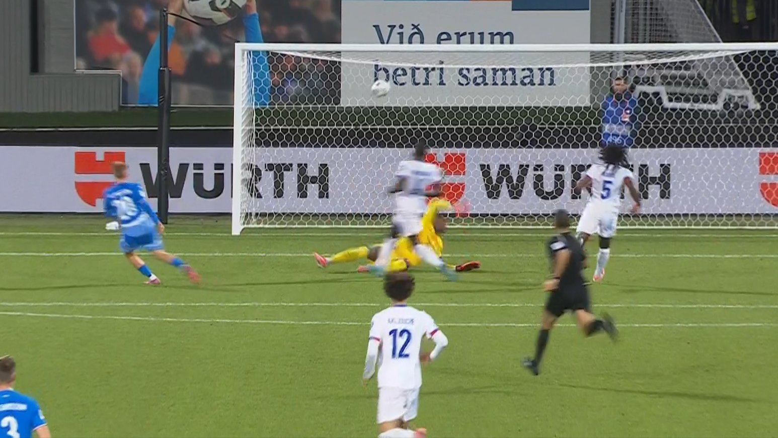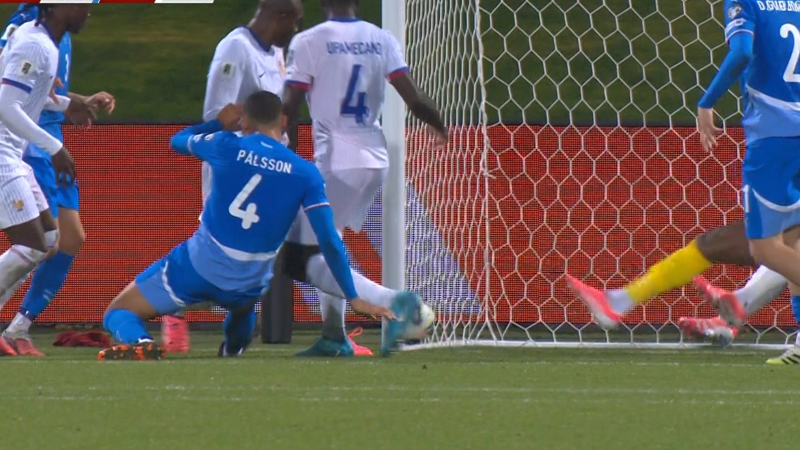 โอกาสของ ฝรั่งเศส อีกครั้ง คุนเด้ เติมสูงรับบอลจาก เอ็นคุนคู ก่อนแตะเข้าซองยิงจากนอกกรอบ บอลแฉลบแล้วไปเข้าซอง โอลาฟสัน