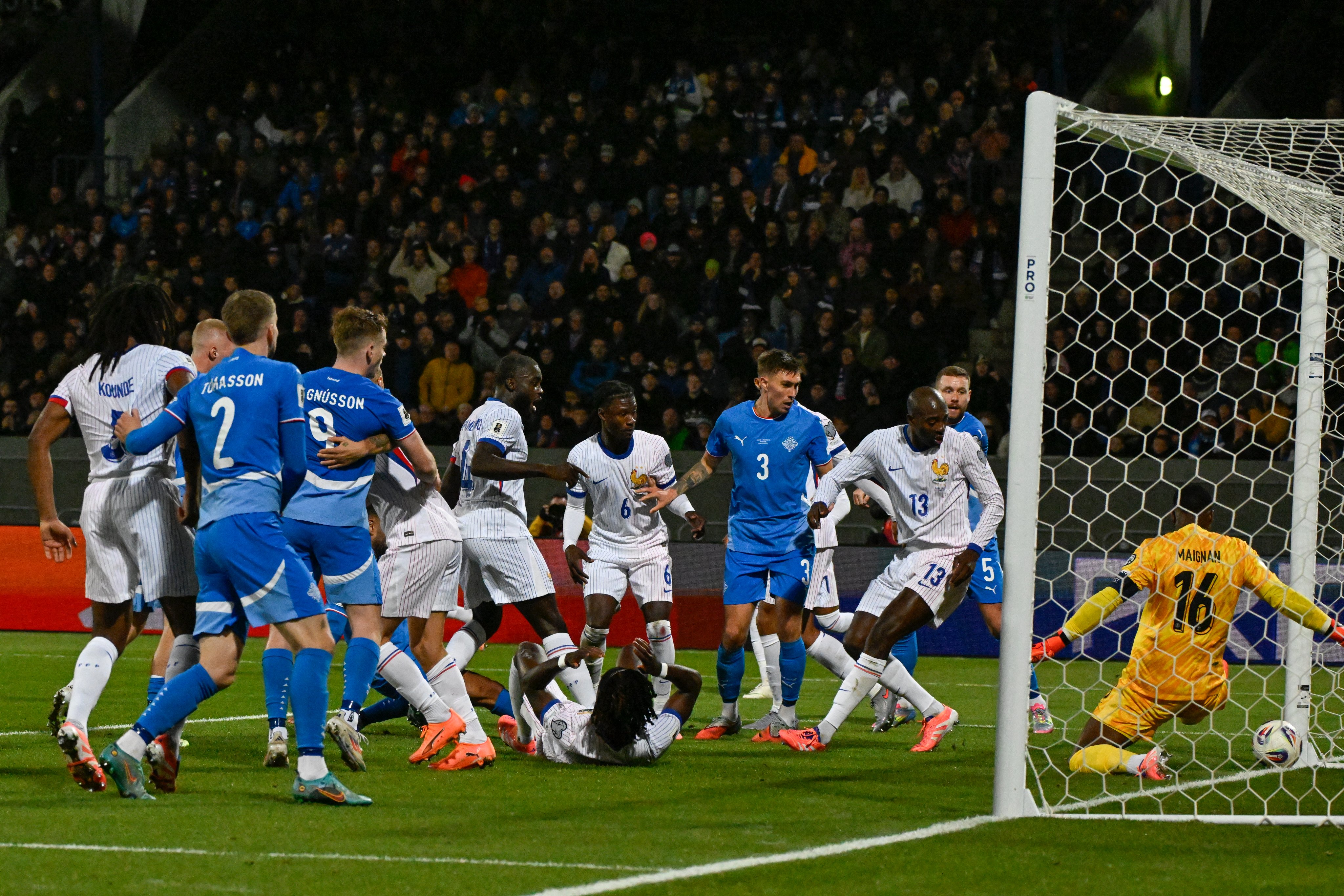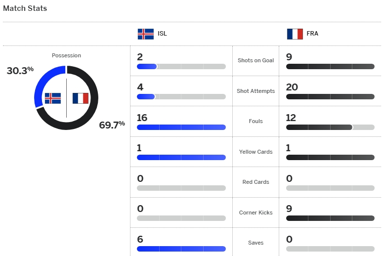 ฝรั่งเศส ได้โอกาสทักทายเร็วจากลูกเตะมุม โอลิเซ่ เปิดให้ คุนเด้ โหม่งหลุดกรอบ จากนั้นไม่กี่อึดใจ คุนเด้ จ่ายให้ เอ็นคุนคู ยิงระยะเผาขนเข้าซอง โอลาฟสัน