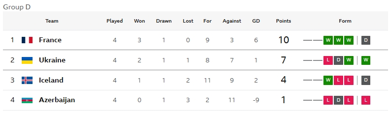 ฝั่งของ ฝรั่งเศส นำจ่าฝูงด้วยผลงาน 9 แต้มเต็มจาก 3 นัดแรก หลังถล่ม อาเซอร์ไบจาน 3-0 แมตช์ล่าสุด
