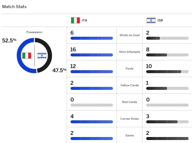 ผ่านครึ่งทาง ภาพรวม อิตาลี ยังดูดีกว่า แต่ยังทำอะไรไม่ได้มากเมื่ออิสราเอลพยายามดึงเกมช้าและแพคโซนรับเหนียวแน่น