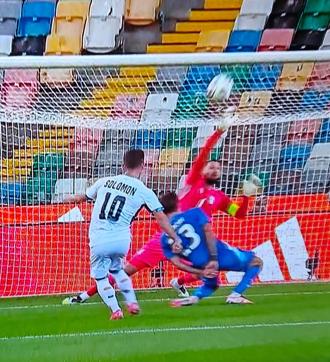 อิตาลีบุกมากว่า แต่จังหวะนี้เกือบโดนเมื่อ อิสราเอลได้โต้กลับ บอลไปจบที่ กลูค ง้างไกยิงตามน้ำหลุดเสาออกหลังน่าได้สุดๆ