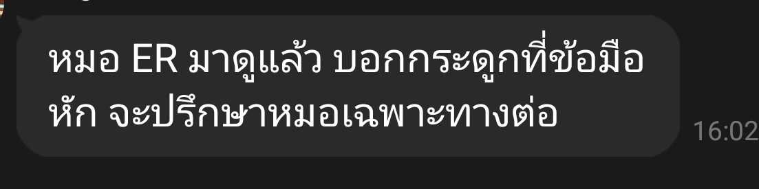 ตอนไปทำบัตรนัด ผมโดนพนักงานว่านิดหน่อยว่า ทำไมไม่มาตั้งแต่เมื่อวาน มาอะไรตอนนี้ ผมยอมรับว่าผิดจริง เพราะไม่รู้เลยว่ามือแกหักหรือแค่โดนตัวอะไรกัด แกไม่ร้องโวยวายอะไรเลยครับ แต่ถ้าจับแกก็จะบอกว่าปวดครับ เขาก็ไล่ให้ไปทำบัตรนัดที่ห้องฉุกเฉินครับ ก็เล่าอาการไปว่าเป็นอะไรยังไง แล้วพยาบาลก็ดู กระดูกข้อมือน่าจะหัก คุณพยาบาลก็เอาแผ่นมาทาบตรงแขนก่อน รอคุณหมอแผนก ER มาตรวจครับ