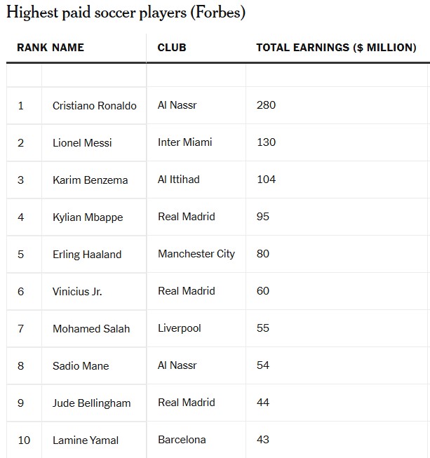 อันดับสามตกเป็นของ คาริม เบนเซม่า ของ อัล อิตติฮัด (104 ล้านเหรียญสหรัฐ), อันดับสี่ คิลิยัน เอ็บบัปเป้ ของ เรอัล มาดริด (95 ล้านเหรียญสหรัฐ) และอันดับห้า เออร์ลิง ฮาลันด์ ของ แมนเชสเตอร์ ซิตี้ (80 ล้านเหรียญสหรัฐ)