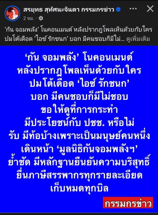 ‘กัน จอมพลัง’ โนคอนเมนต์ หลังปรากฎโพลเห็นด้วยกับใคร ปมโต้เดือด ‘ไอซ์ รักชนก’ บอก มีคนชอบก็มีไม่ชอบ ขอให้ดูที่การกระทำ มีประโยชน์กับ ปชช. หรือไม่ รับ มีท้อบ้างเพราะเป็นมนุษย์คนหนึ่ง เดินหน้า ‘มูลนิธิกันจอมพลัง ช่วยสู้’ ย้ำชัด มีหลักฐานยืนยันความบริสุทธิ์ ยื่นภาษีสรรพากรทุกรายละเอียด เก็บหมดทุกบิล