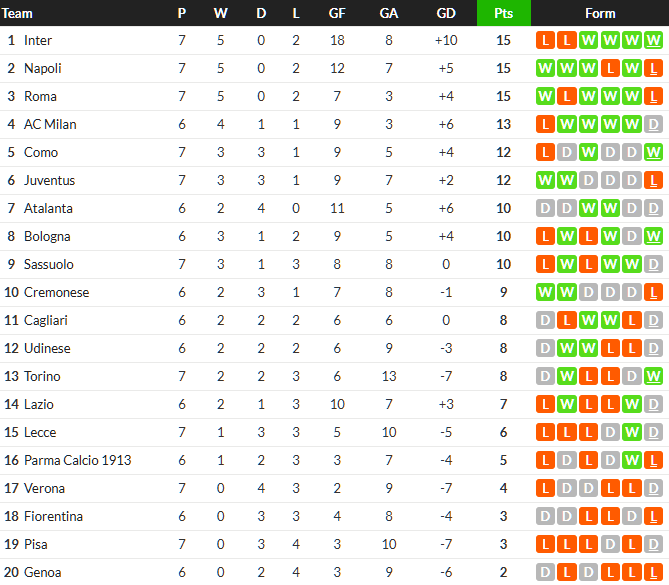 ส่วนทางด้าน โคโม่ ขยับมาอยู่อันดับ 5 ก่อนโดยมีแต้มเท่ากับ ยูเวนตุส ที่ 12 แต้มและประตูได้เสียดีกว่า