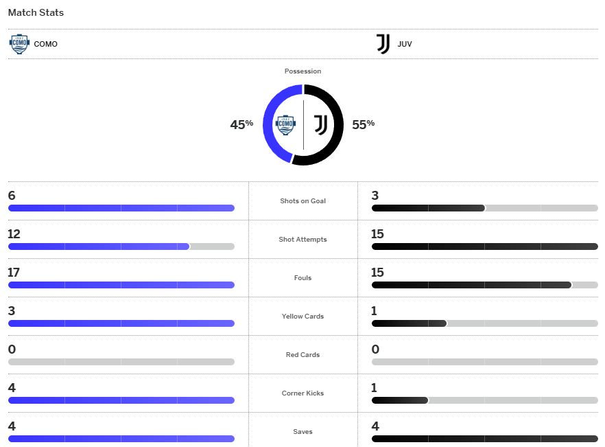 ยูเวนตุส ไม่รอดเจอ นิโก้ ปาซ โชว์ฟอร์มเยี่ยมด้วยการทำแอสซิสต์ให้ โคโม่ ออกนำตั้งแต่นาทีที่ 4 และถึงแม้ ม้าลาย จะสร้างโอกาสได้แต่ก็ไม่พบประตูที่ต้องการก่อนจะถูก ปาซ ยิงฝังพ่าย 2-1 ไร้ชัยเพิ่มเป็น 6 นัดติดต่อกันในทุกรายการ