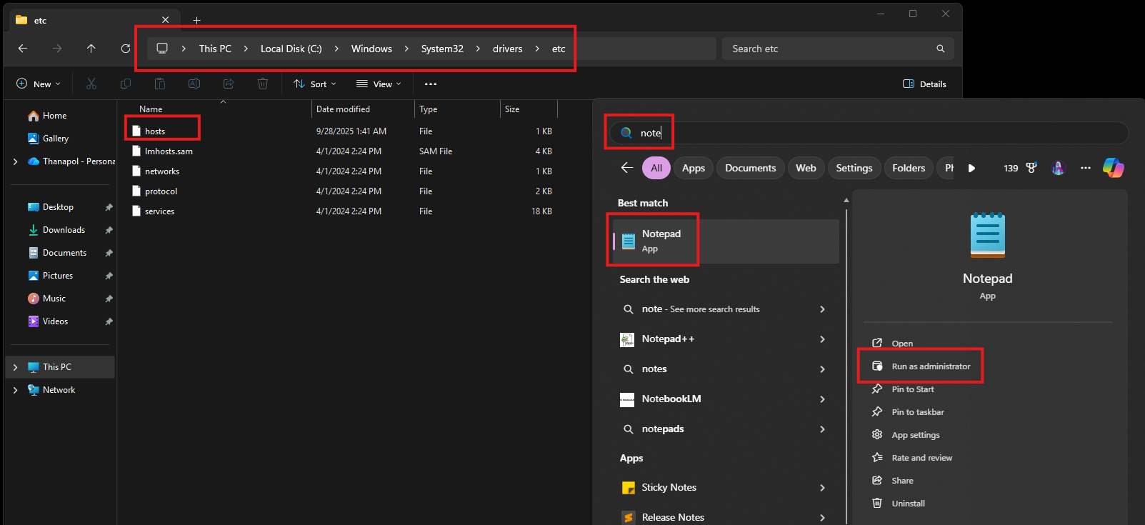 2. เปิด File Explore หา File Hosts (C:\Windows\System32\drivers\etc)