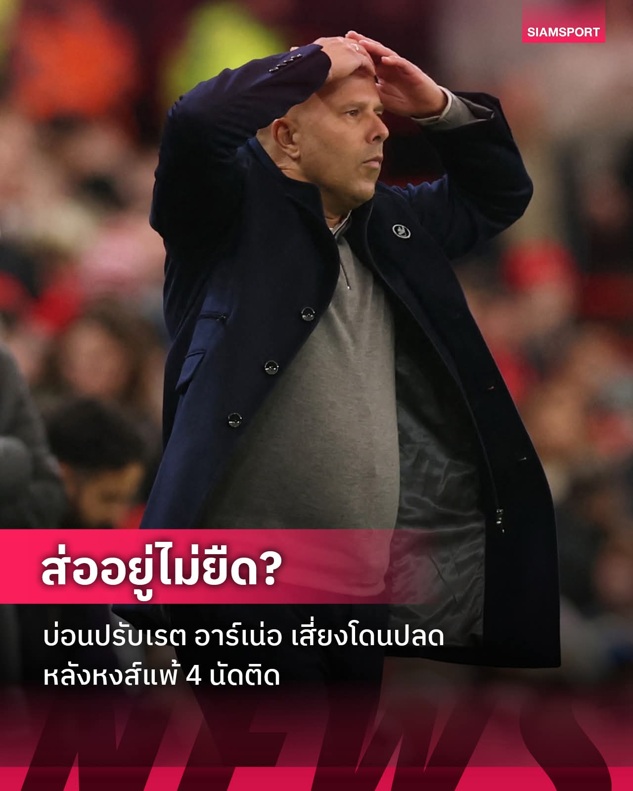 แรงกดดันเริ่มถาโถมใส่ อาร์เน่อแล้ว หลังพา ลิเวอร์พูล แพ้ 4 นัดรวดรวมทุกรายการ ล่าสุดบ่อนดังอังกฤษ “วิลเลี่ยม ฮิลล์” ปรับราคาให้เขากลายเป็นเต็งต้น ๆ ที่อาจถูกปลดจากตำแหน่ง โดยอัตราเหลือเพียง 14/1 (แทง 1 ได้ 14 ไม่รวมทุน)