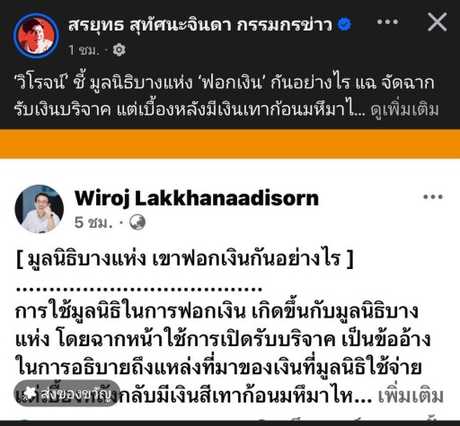 ‘วิโรจน์’ ชี้ มูลนิธิบางแห่ง ‘ฟอกเงิน’ กันอย่างไร แฉ จัดฉากรับเงินบริจาค แต่เบื้องหลังมีเงินเทาก้อนมหึมาไหลเข้า ก่อนทำสัญญาจัดซื้อจัดจ้างในราคาที่สูงเกินจริง-เป็นเท็จ กับบริษัทเครือข่าย
