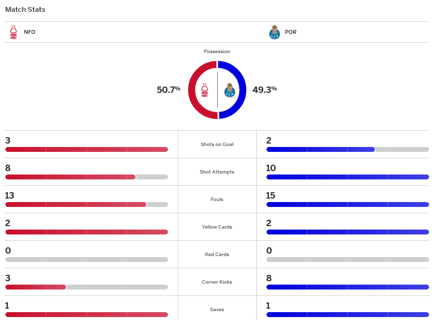 ช่วงที่เหลือไม่มีโอกาสหวาดเสียวเพิ่ม จบเกม ฟอเรสต์ เอาชนะ ปอร์โต้ ไปได้ 2-0 นั่นทำให้พวกเขาหาชัยชนะนัดที่สองของฤดูกาลพบแล้ว หลังจากก่อนหน้านี้ไร้ชัย 10 เกมติดต่อกัน แถมนี่ยังเป็นคลีนชีตแรกของซีซั่นด้วย
