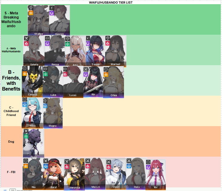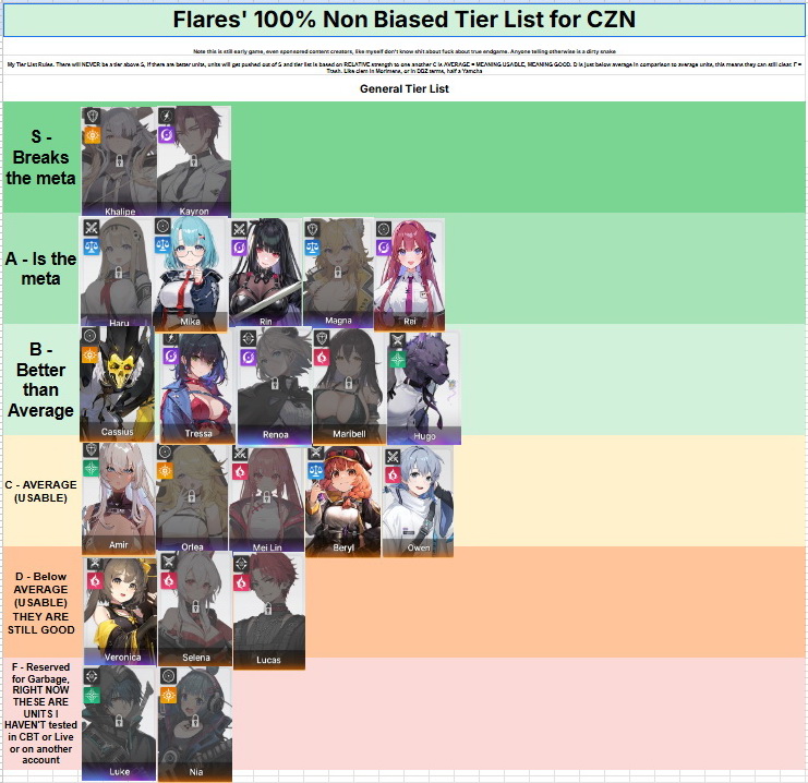 ผมว่าเทียร์นี้น่าจะถูกปรับแล้วนะ จากกระแสตอนนี้ Mei lin น่าจะ S Cassius ก็น่าจะอยู่เทียร์สูง เผลอๆ S เพราะมันเพิ่มจำนวนจจั่วได้เยอะมาก Khalipe ถูกเนิฟจาก CB แล้วแต่น่าจะยัง S อยู่