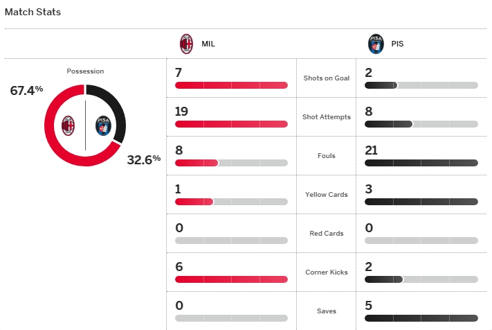 ทีมน้องใหม่กลายเป็นของแสลงสำหรับ เอซี มิลาน แม้ว่า ราฟาเอล เลเอา ยิงให้พวกเขาออกนำเร็วแล้วเกมก็ดูดีกว่าชัดเจน แต่แล้ว ปิซ่า มาแบบไม่มีปี่มีขลุ่ยยิงแซงจากจุดโทษของ ฮวน กวาดราโด้ และ เอ็มบาล่า เอ็นโซล่า ในครึ่งหลัง ยังดีที่ ซาชารี่ อาเธคาเม่ มายิงตีเสมอช่วงทดเจ็บ จบเกมเลยแบ่งแต้มไป 2-2 ทำให้ตำแหน่งจ่าฝูงสั่นคลอน
