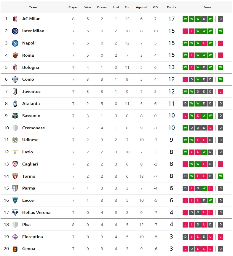จบเกม เอซี มิลาน เปิดบ้านเสมอ ปิซ่า 2-2 เก็บเพิ่มเป็น 17 คะแนนจาก 8 เกม ตำแหน่งจ่าฝูงสั่นคลอน เพราะมีโอกาสที่ อินเตอร์ มิลาน, นาโปลี และ อาแอส โรม่า ที่ต่างมี 15 แต้ม จะแซงเอา