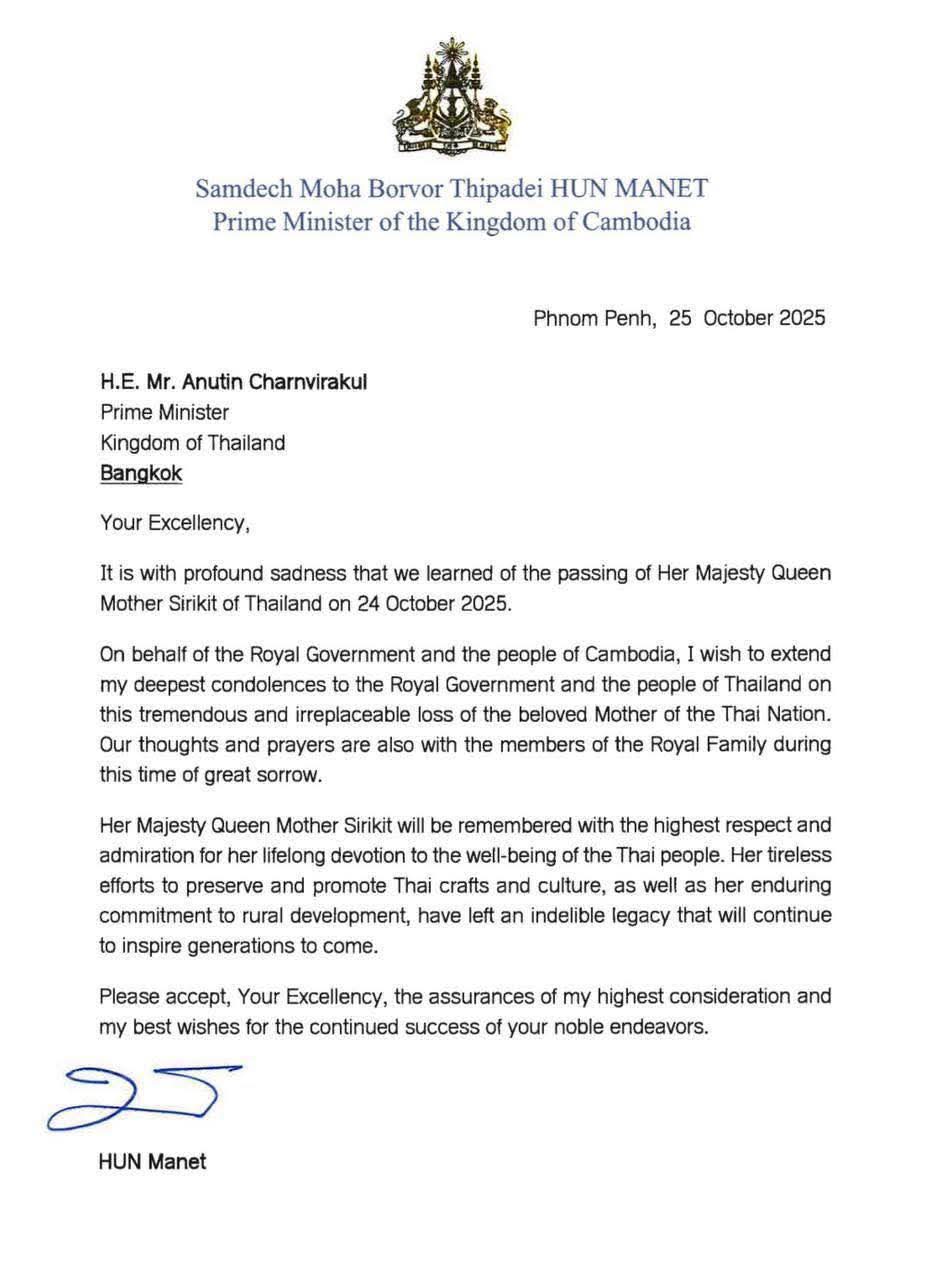 รัฐบาลกัมพูชา เผยแพร่หนังสือของนายฮุน มาเนต นายกรัฐมนตรีกัมพูชา ที่ส่งถึงนายอนุทิน ชาญวีรกูล นายกรัฐมนตรีไทยในวันนี้ (25 ต.ค.) โดยระบุว่า เป็นความโศกเศร้าที่ได้รับทราบการสวรรคตของสมเด็จพระนางเจ้าสิริกิติ์ พระบรมราชินีนาถ พระบรมราชชนนีพันปีหลวง เมื่อวันที่ 24 ต.ค. ที่ผ่านมา