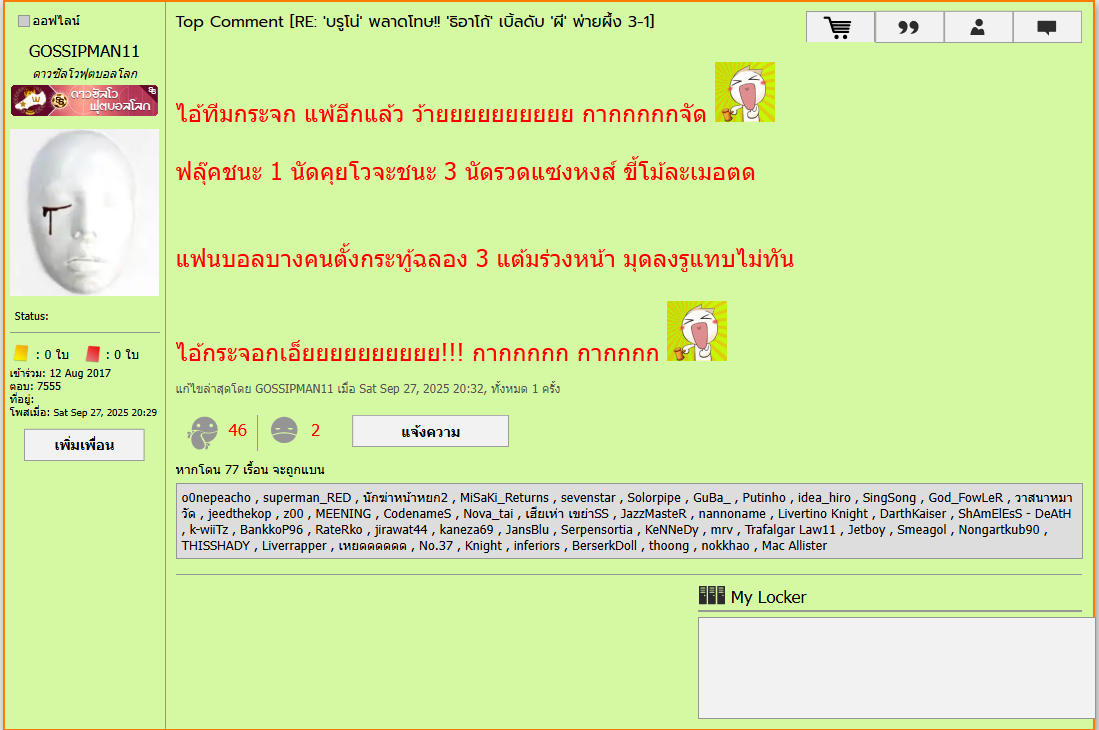 ผมงงตรงที่ก่อนแข่ง กระทู้ 7-0 เยอะแยะไปหมด หลังจากเกมส์นั้นจนถึงตอนนี้ หายหัวกันไปหมด เหลือแต่แฟนหงส์ดีๆ รับแรงกระแทกให้
