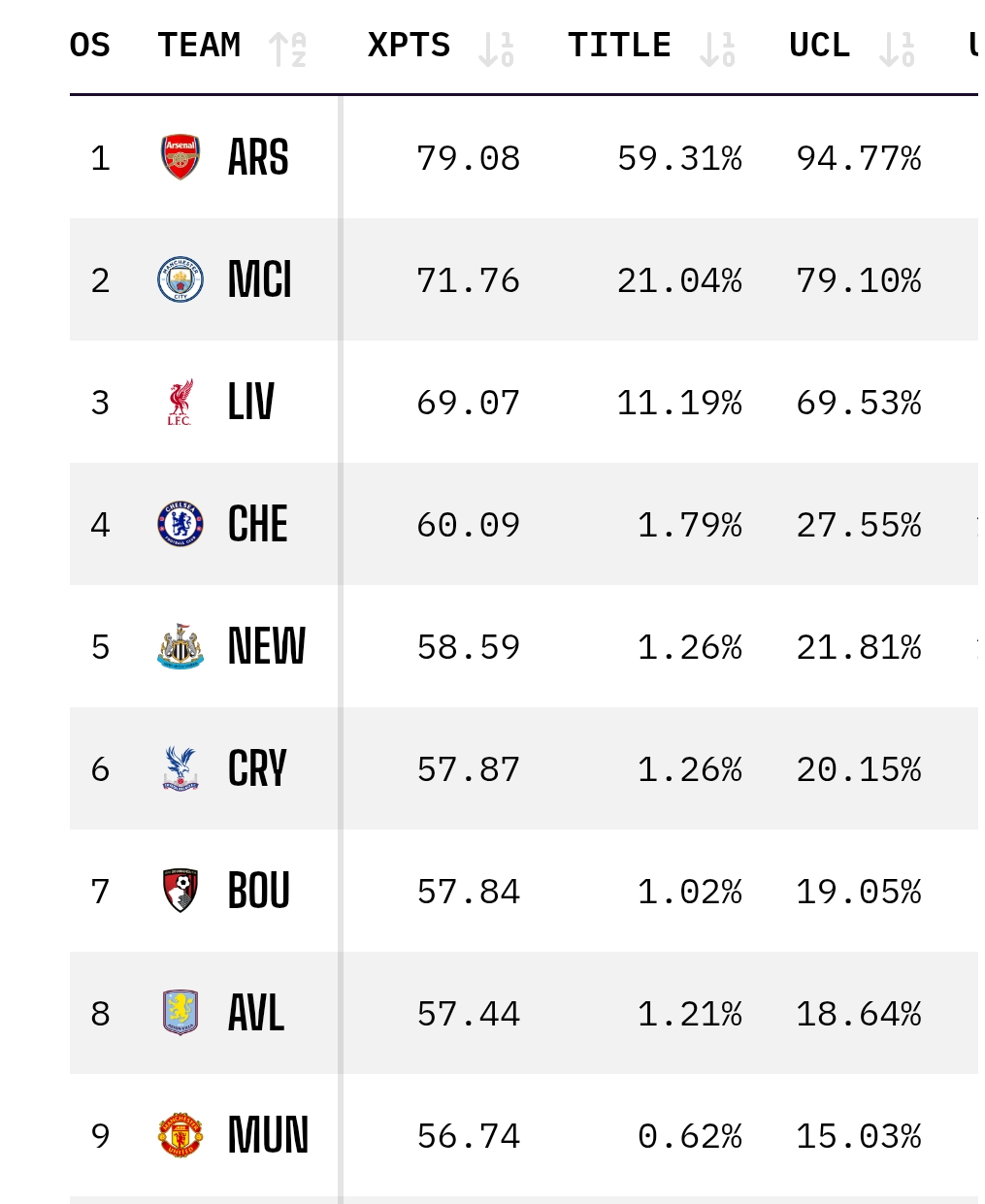 สังเกตุจากexpected pointที่ปล่อยมากี่รอบก็ต่ำทุกรอบเพราะคะแนนมันต้องไปเฉลี่ยกับโอกาสที่แพ้ แต่ทีมที่เป็นแชมป์ยังไงผลงานก็ต้องดีเกิดค่าคาดการณ์ เช่นarsenalอาจจะได้79ตามที่คำนวนอาจมีทีมอื่นที่ทำแต้มได้ดีกว่าค่าคาดการณ์เลยจบที่หนึ่งแทน