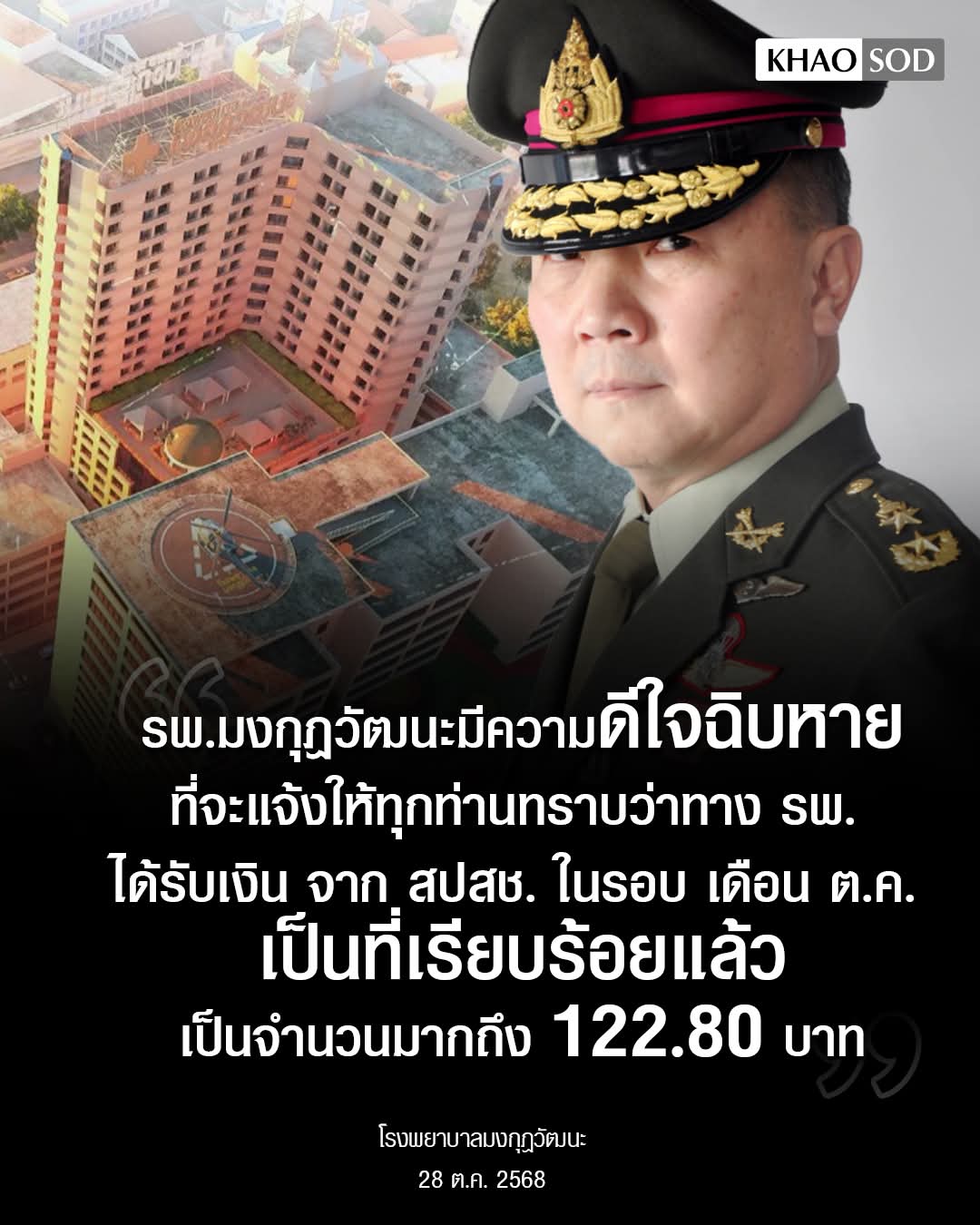รพ.มงกุฎวัฒนะ แจ้ง 'ดีใจฉิบหาย' สปสช. จ่ายเงินให้แล้ว 122 บาท