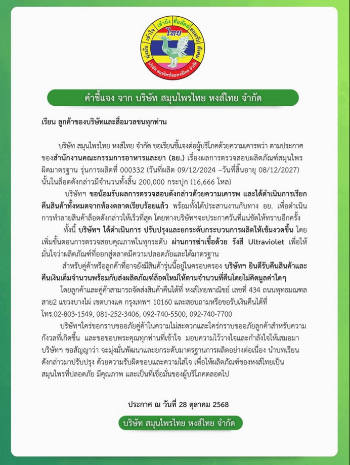 บริษัทผลิตยาหม่อง ตรา สมุนไพรหงส์ไทย ชี้แจงล็อตที่ อย. ตรวจว่าปนเปื้อนแล้วครับ
