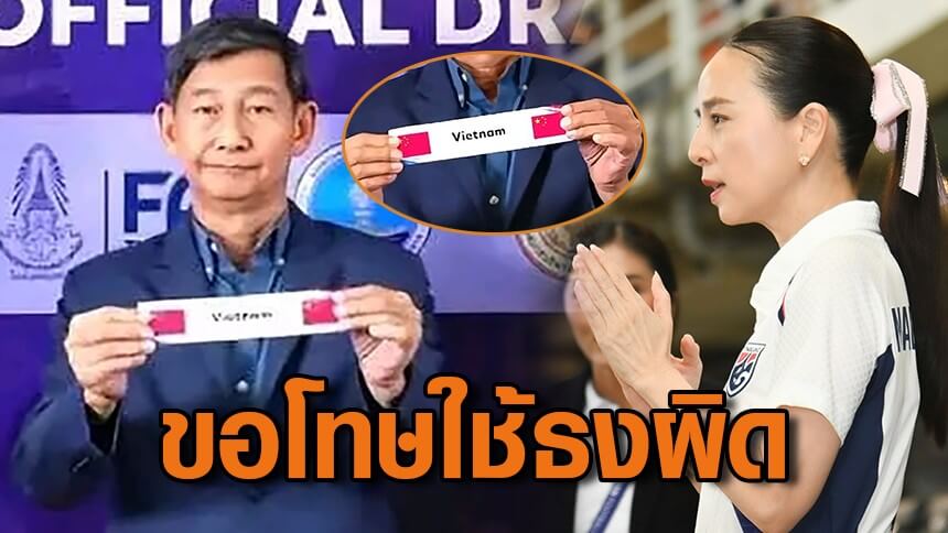 สมาคมฟุตบอลไทยฯ – มาดามแป้ง ส่งหนังสือโร่ขอโทษทีมฟุตซอลเวียดนาม หลังเกิดดรามาในพิธีจับสลากชิงแชมป์อาเซียน 2025 รุ่นอายุไม่เกิน 19 ปี เกิดความผิดพลาด ใช้ธงชาติผิดจากเวียดนามเป็นจีน