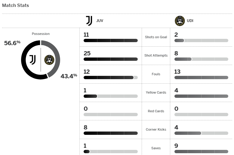 ยูเวนตุส หยุดสถิติไม่ชนะใครลงไว้ที่ 8 นัดรวมทุกรายการ หลังล่าสุดเก็บชัยชนะเป็นครั้งแรกด้วยการเปิดบ้านชนะ อูดิเนเซ่ 3-1 เจ้าบ้านขึ้นนำก่อนจาก ดูซาน วลาโฮซิช ซัดจุดโทษอย่างไวนาทีที่ 5 แม้ว่า นิโคโล่ ซานิโอโล่ ยิงตีเสมอให้ทีมเยือนนาที 45+1 แต่ ม้าลาย มายิงสองลูกรวดจาก เฟเดริโก้ กัตติ นาที 67 และจุดโทษปิดกล่องของ เคนาน ยิลดิซ นาที 90+6 พร้อมเก็บ 3 คะแนนไปครอง