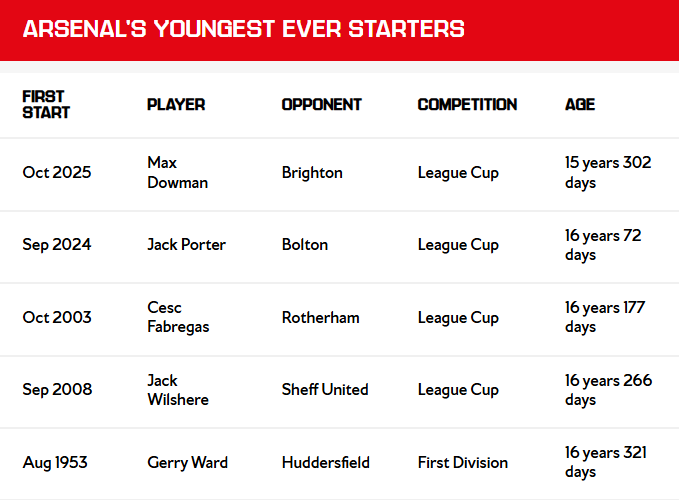 แม็กซ์ ดาวแมน แนวรุกดาวรุ่ง สร้างสถิติเป็นแข้งอายุน้อยที่สุดที่ได้ออกสตาร์ตตัวจริงให้ อาร์เซน่อล ก่อนเตรียมลงแข่ง คาราบาว คัพ เปิดบ้านพบ ไบรท์ตัน คืนวันพุธนี้
