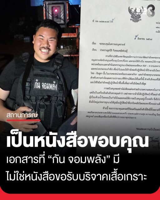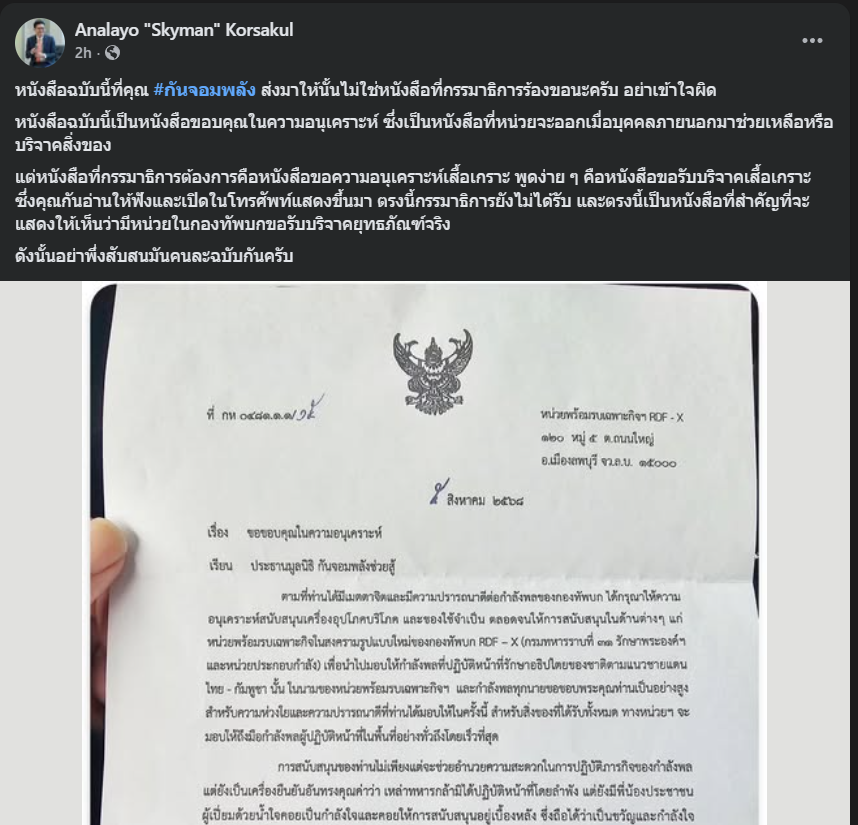 [RE: ส่อวุ่น! เอกสารที่กองทัพส่งให้ “กัน จอมพลัง” คือหนังสือขอบคุณ ไม่ใช่ขอรับบริจาค]