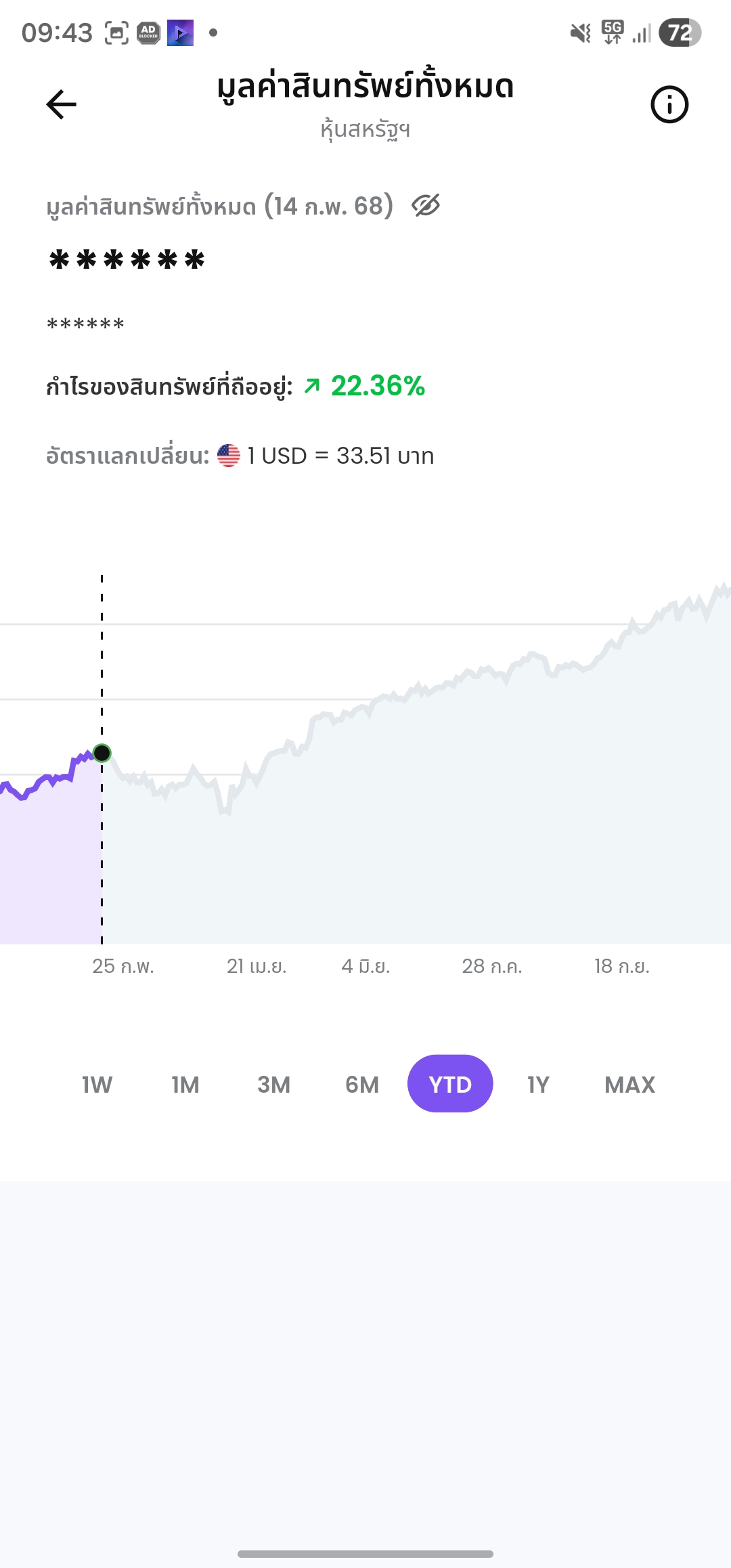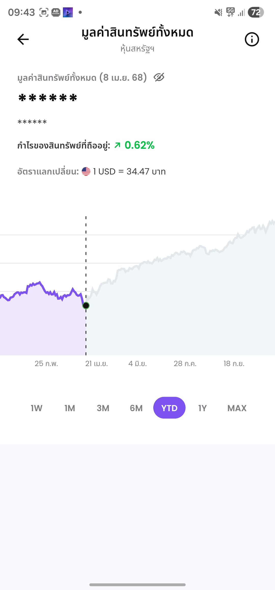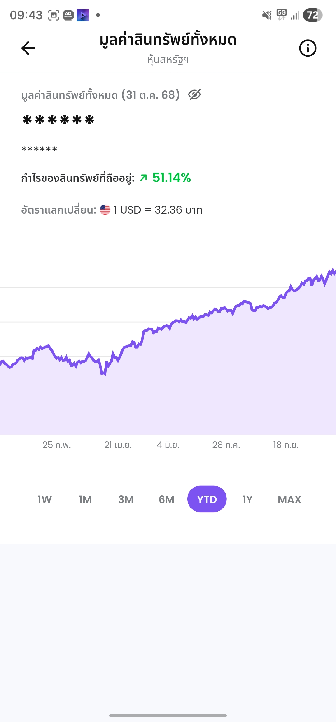 ปีที่แล้วจบธันวาคม +13% ก่อนมันจะไปพีคต้นปีที่ 22% แล้วอยู่ๆเดือนเมษาก็ตกแบบดิ่งเลยใจผมแทบหายไปที่ตาตุ่มจากกำไรอยู่ดีๆเท่าทุน แต่ก็เป็นจุดเริ่มต้นของการปรับ Port ผมก็แก้ไปตอนนี้ +50% = ผลประกอบการ 2 ปี ปีละ 25% ซึ่งสำหรับมือใหม่อย่างผมโอเคแล้วเสียค่าเงินบาทแข็งค่าไม่งั้นผมได้ +30% แล้ว