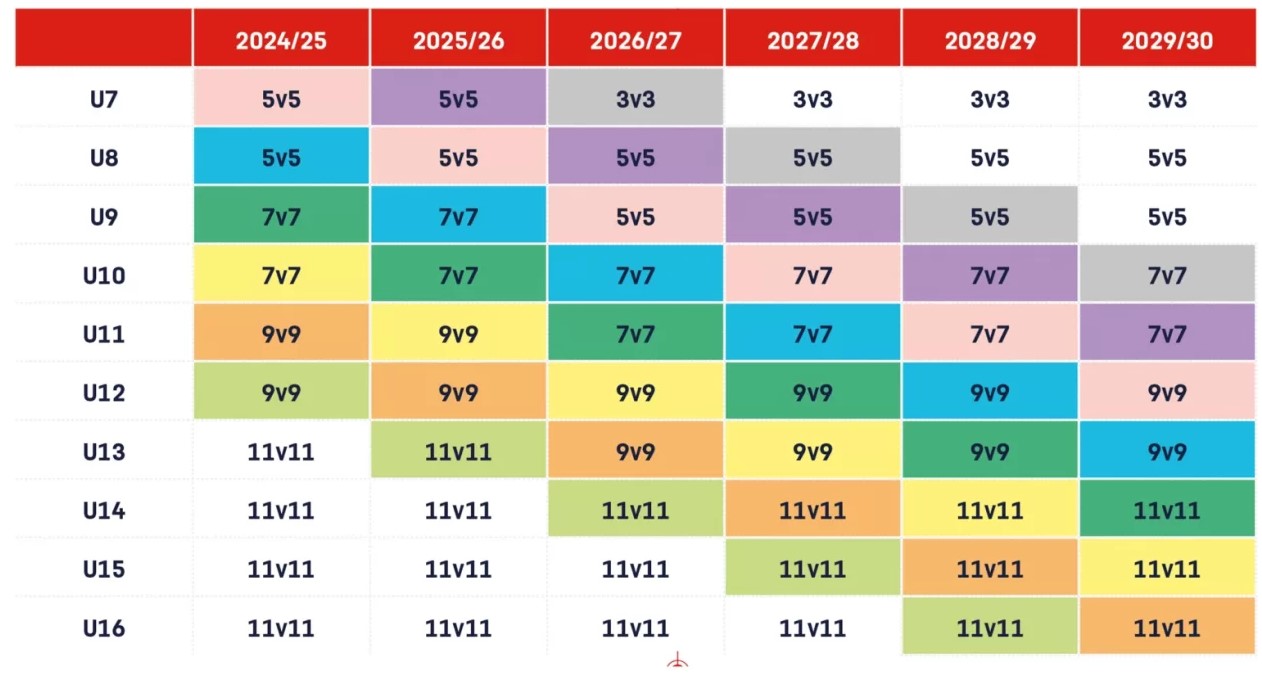 จริงๆที่อังกฤษพยายามดีเลย์อายุเด็ก ไม่ให้เล่น11 คน เร็วเกินไปอยู่นะครับ ปัจจุบันเปลี่ยนมาเป็น U13 และจะเปลี่ยนเป็น U14 ในปีหน้า ถ้าเป็นเมื่อก่อนอาจจะเตะ 11 คนกันตั้งแต่เด็กๆ แต่เดี๋ยวนี้เด็กอะคาเดมี่อังกฤษไม่ได้เตะ 11 คน ตั้งแต่ยังเล็กหรือทุกช่วงอายุแล้วครับ