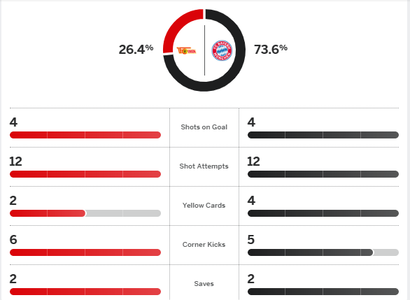 อูนิโอน โจมตีด้วยเตะมุมอีกครั้งเปิดให้ โดกี้ วอลเลย์ในเขตโทษบอลตรงตัวแต่ นอยเออร์ รับไม่อยู่ตุงตาข่าย เจ้าถิ่นนำ 1-0