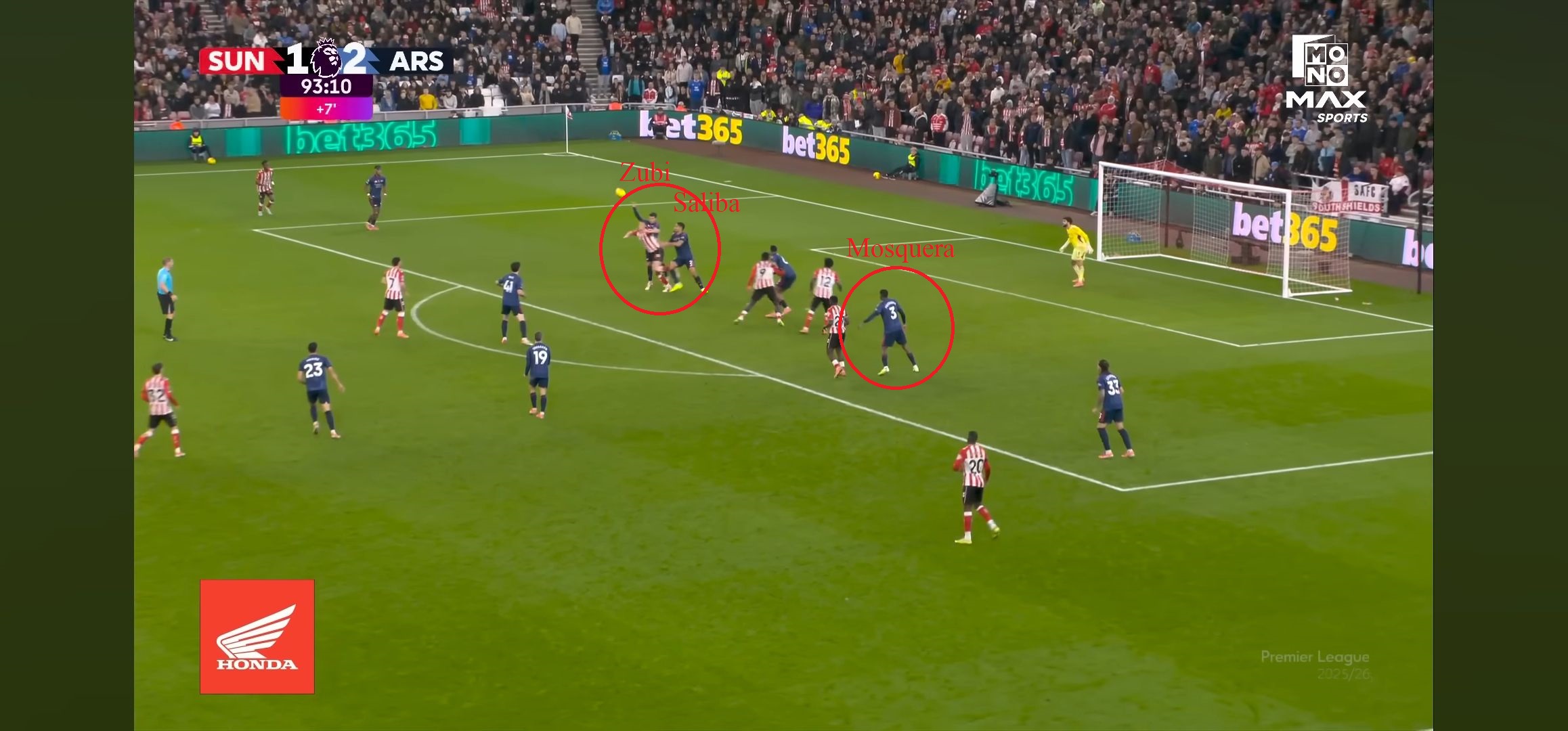 จังหวะก่อนบอลจะมาถึงกาเบียล ซาลิบาขึ้นโหม่งพร้อมกับมอสเคร่าโดยมีผู้เล่นซันเดอร์แลนด์ตัวเดียว ถ้าซาลิบา ปล่อยให้ดวล1-1 ไม่ขยับออกไป ยืนcoverพื้นที่ยังไงบอลก็มาตกตรงหน้าอยู่ดี ถ้าไม่ใช่เพราะเคยชินกับการยืนคู่2มาทั้งเกม ภาพนี้คงไม่เกิด