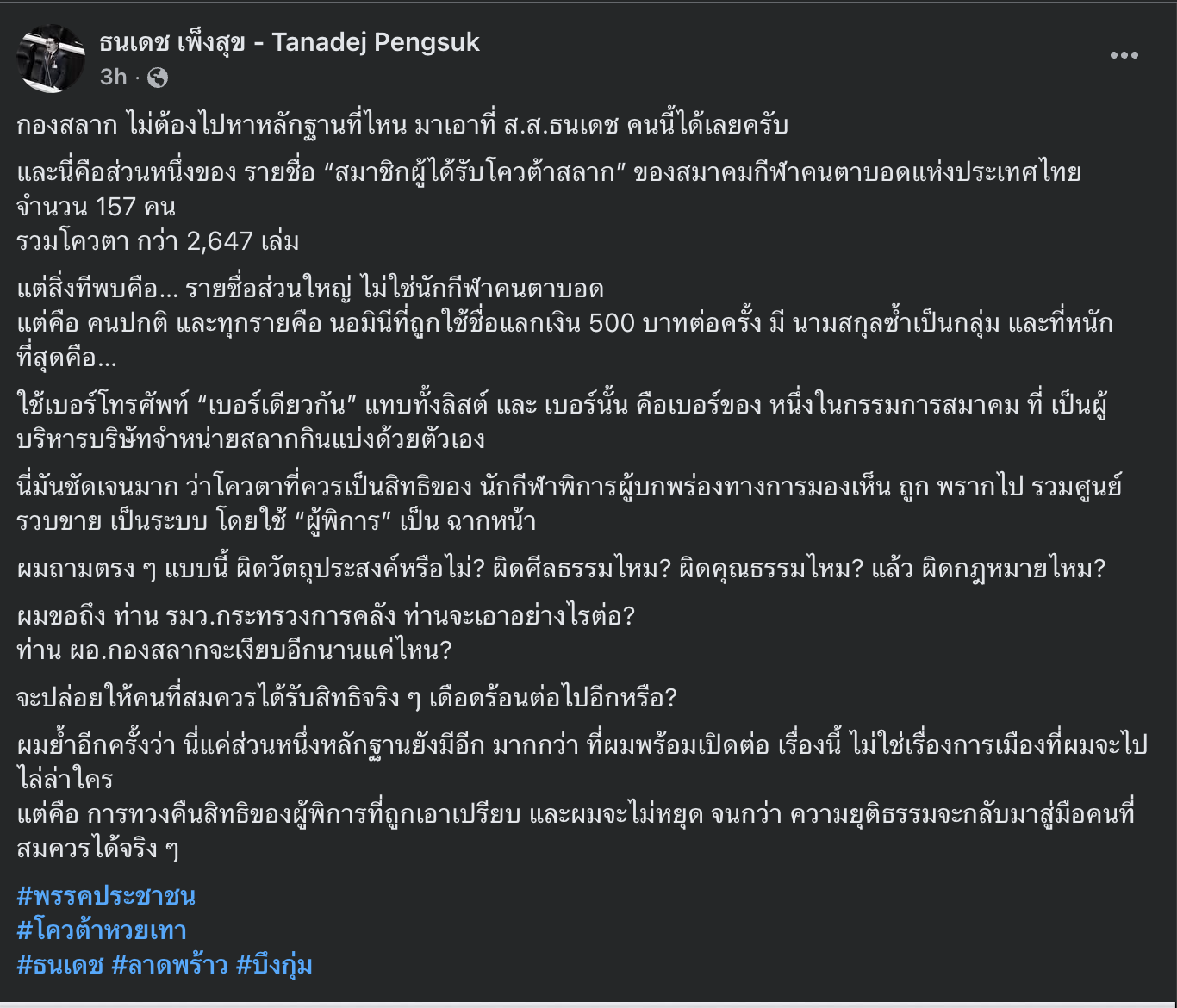 [RE: ส.ส.ธนเดช (พรรคประชาชน) เปิดหลักฐานสมาชิกผู้ได้รับโควต้าสลากบางส่วน]