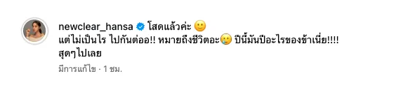 ก่อนหน้านี้ทำเอาหลายคนตกใจ เมื่อได้เห็น นิวเคลียร์ หรรษา ออกมาโพสต์ภาพ พร้อมเขียนข้อความว่า “โสดแล้วค่ะ แต่ไม่เป็นไร ไปกันต่ออ!! หมายถึงชีวิตอะ ปีนี้มันปีอะไรของข้าเนี่ย!!!! สุดๆ ไปเลย” ก่อนจะแก้ไขข้อความเป็น “โสดแล้วค่ะ เข้มแข็งเร็วๆนะนิวเคลียร์”