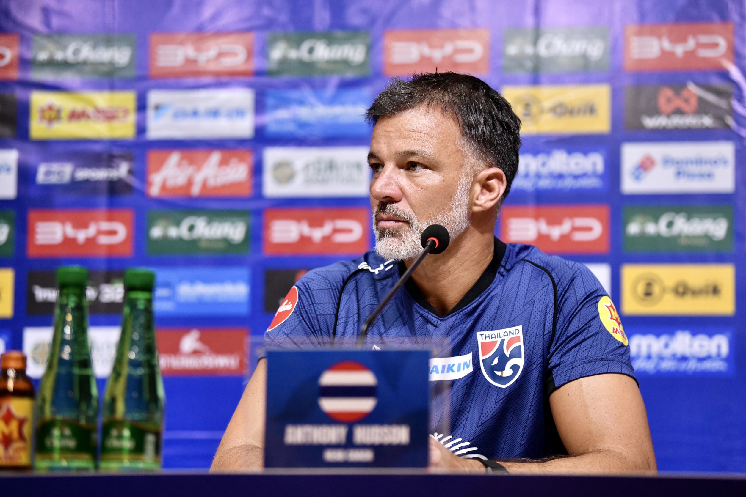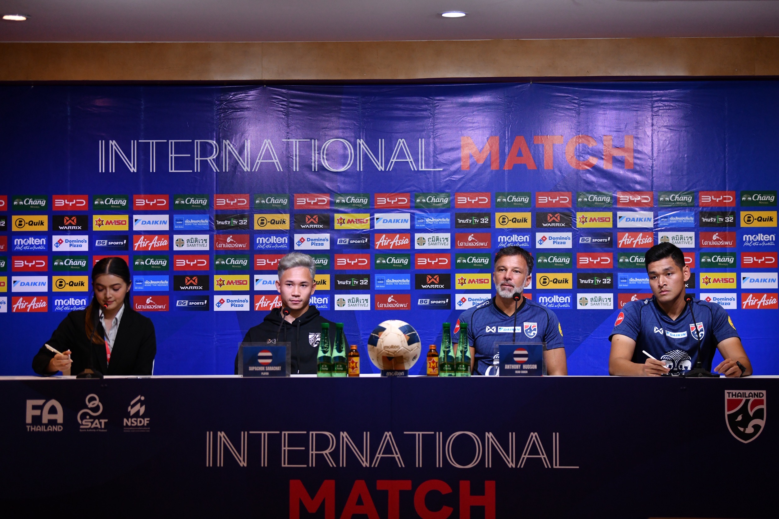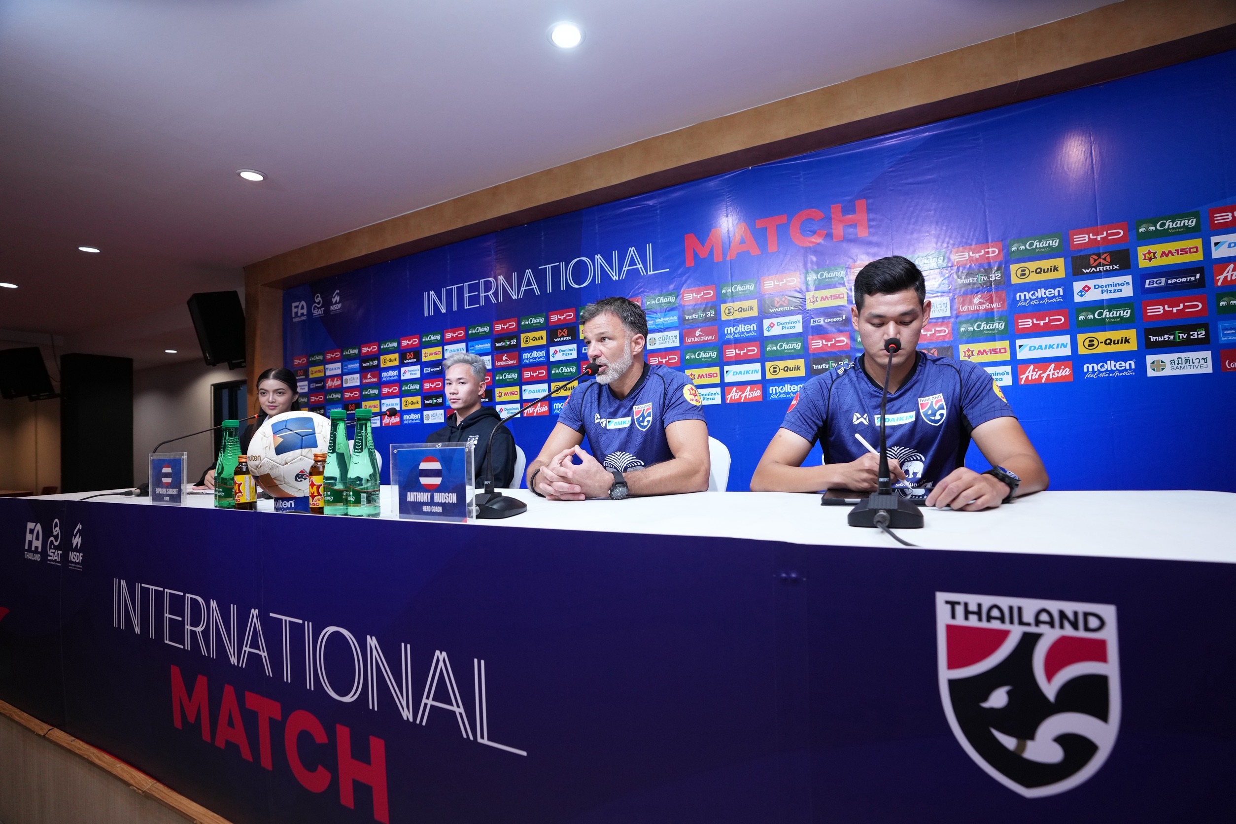 เมื่อเวลา 16.20 น. วันที่ 12 พฤศจิกายน 2568 ณ ห้องแถลงข่าวสนาม ธรรมศาสตร์ สเตเดียม แอนโธนี ฮัดสัน กุนซือทีมชาติไทยชุดใหญ่ พร้อมด้วย สุภโชค สารชาติ ได้แถลงความพร้อมก่อนเกมอุ่นเครื่องพบกับ ทีมชาติสิงคโปร์