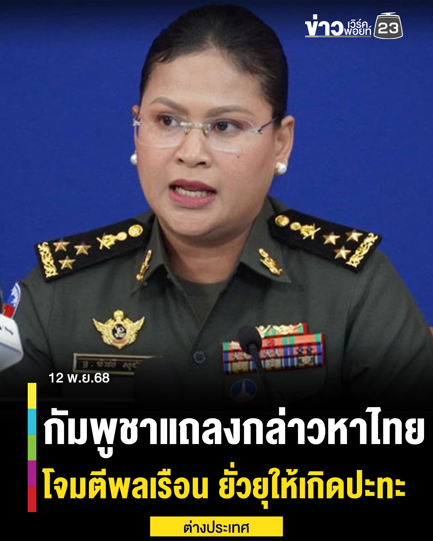 (12พ.ย.68) พล.ท.มาลี โสเจียตา ปลัดกระทรวงกลาโหมและโฆษกกระทรวงกลาโหมกัมพูชา ขอแจ้งสถานการณ์ตามแนวชายแดนกัมพูชา -ไทย ให้สาธารณชน สื่อมวลชนทั้งในประเทศและต่างประเทศทราบในวันนี้ ระบุว่า เวลาประมาณ 15.50 น. กองทัพไทยได้เปิดฉากยิงพลเรือนชาวกัมพูชาที่หมู่บ้านเปรยจัน ตำบลโอเบชอน อำเภอโอชรอฟ จังหวัดบันเตียเมียนเจย จากข้อมูลเบื้องต้นของหน่วยงานท้องถิ่น เหตุการณ์นี้ส่งผลให้พลเรือนได้รับบาดเจ็บ 5 ราย การโจมตีครั้งนี้เกิดขึ้นหลังจากที่กองทัพไทยได้ดำเนินการยั่วยุหลายครั้งในช่วงไม่กี่วันที่ผ่านมา โดยมีเจตนาที่จะยุยงให้เกิดการปะทะกัน