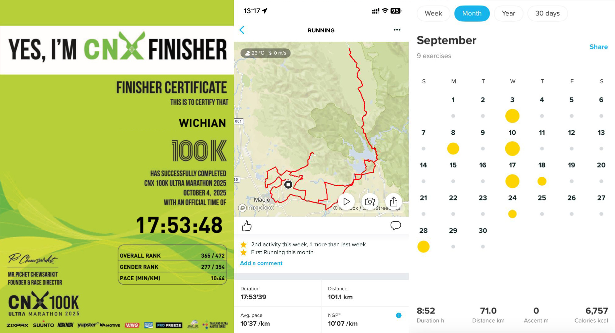 ผมจบ CNX100 2025 ระยะทาง 100 กิโลเมตร โดยที่ 1 เดือนก่อนหน้าซ้อมแค่ 71 กิโลเมตร ส่วนเดือนสิงหาซ้อมได้แค่ 105 กิโลเมตร มี LONG RUN แค่ 16 กิโลเมตร เพราะมีปัญหาเรื่องข้อเท้านิดหน่อยเลยไม่ได้ซ้อมเยอะ ก็จบแบบทันเวลาเฉียดฉิว