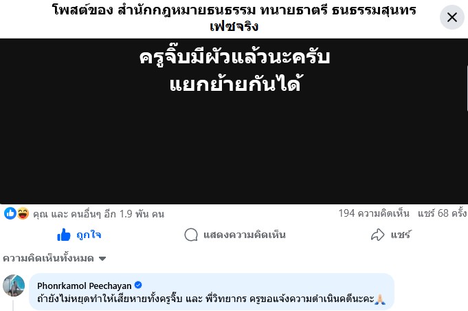 [RE: เพจทนายธาตรีวินเรท 100% ผวา ครูจิ๊บขู่ฟ้องเพราะทำให้เสียหาย]