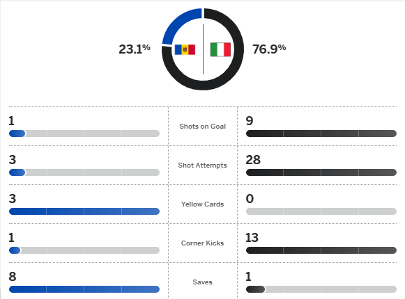 อิตาลี ครองบอลขึงตลอดเกม ต้องรอนาที 87 จึงได้ จานลูก้า มันชินี่ กองหลังเติมยิงปลดล็อค แล้วทดเจ็บ 90+2 ปิโอ เอสโปซิโต้ หอกดาวรุ่งบวกเพิ่ม บุกชนะ มอลโดว่า 2-0 ต่อลมหายใจยังมีลุ้นจบแชมป์กลุ่มคัดบอลโลก โดยตาม นอร์เวย์ 3 แต้ม ลูกได้น้อยกว่า 17 ประตู นัดสุดท้ายมีโปรแกรมเจอกันเอง