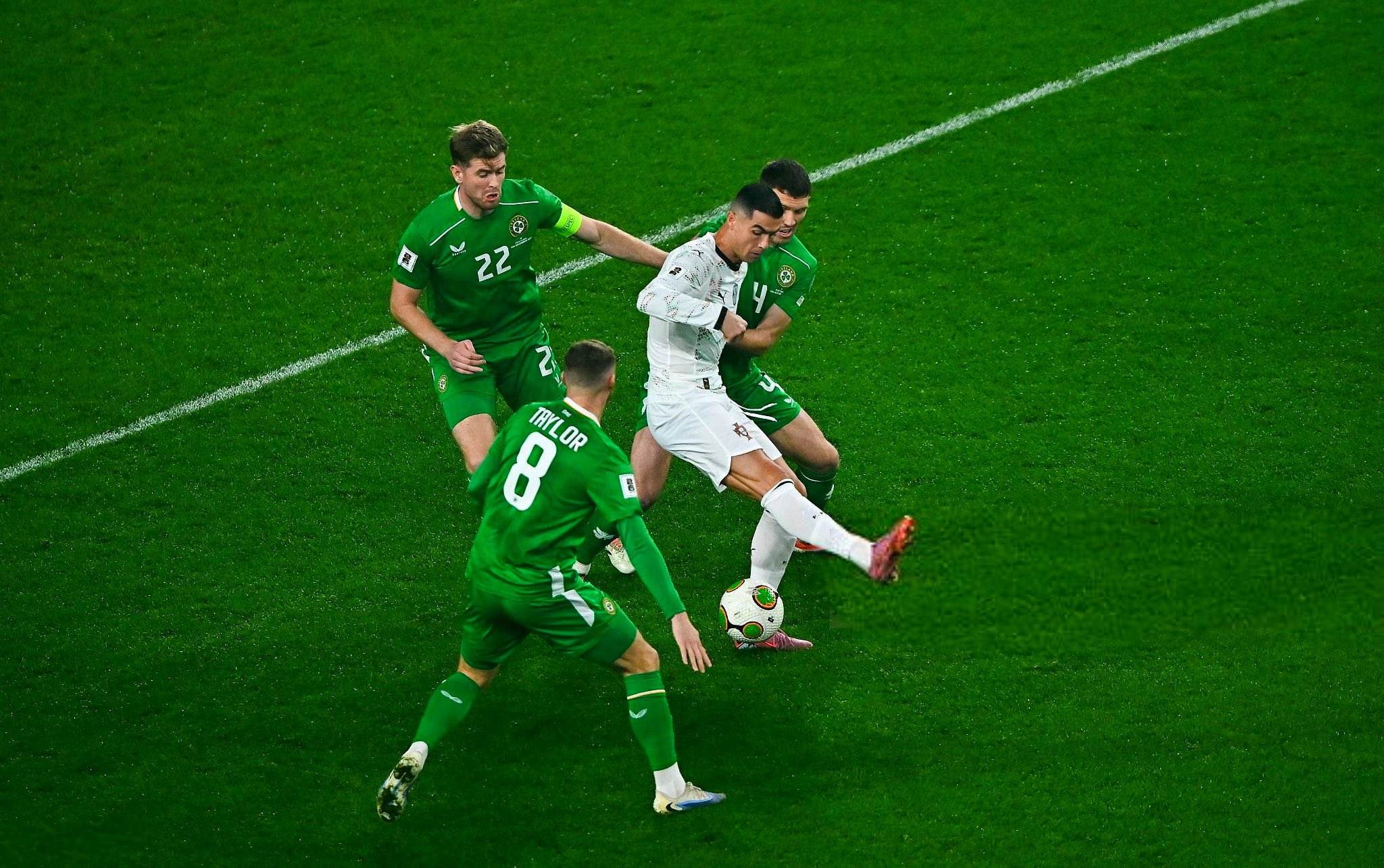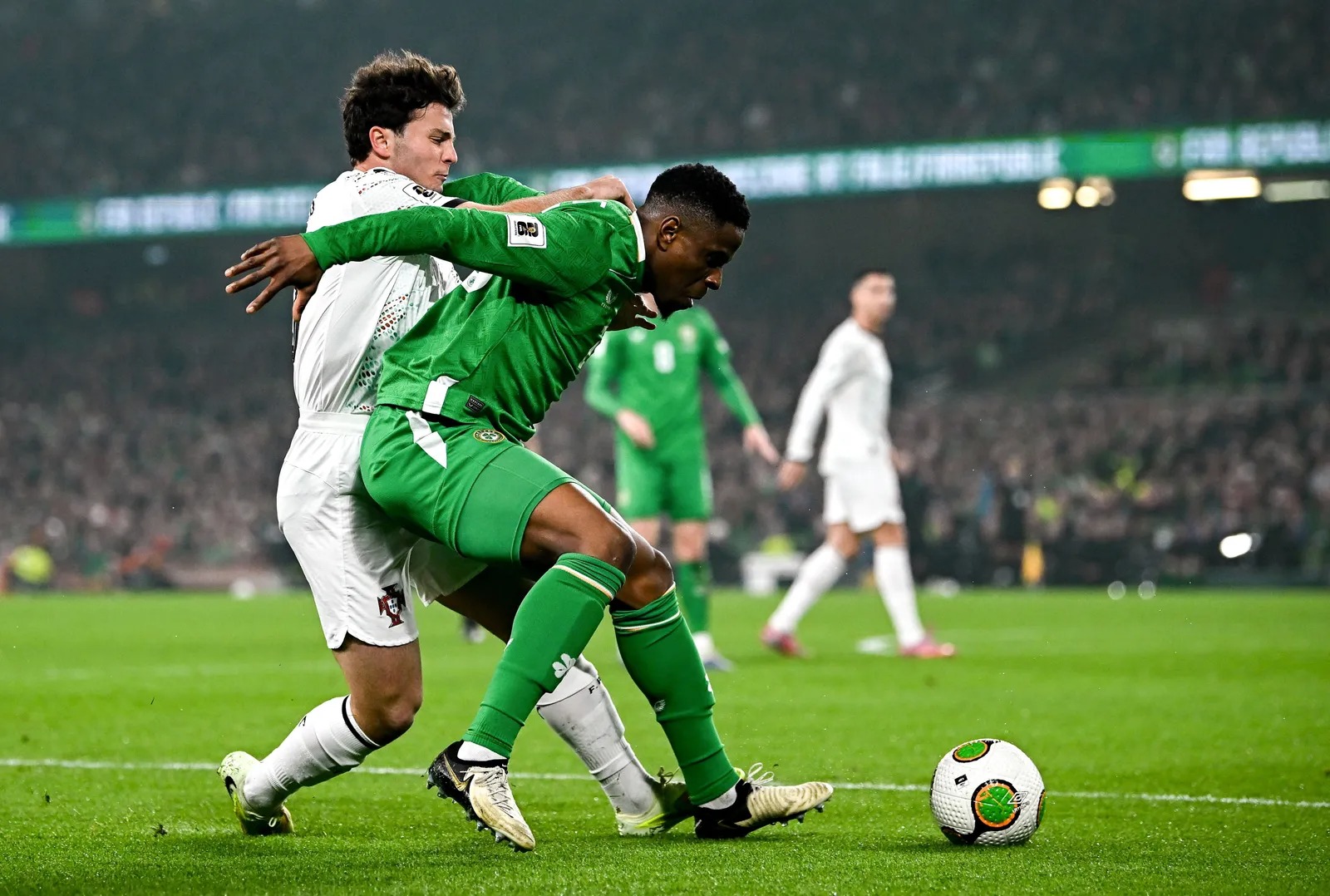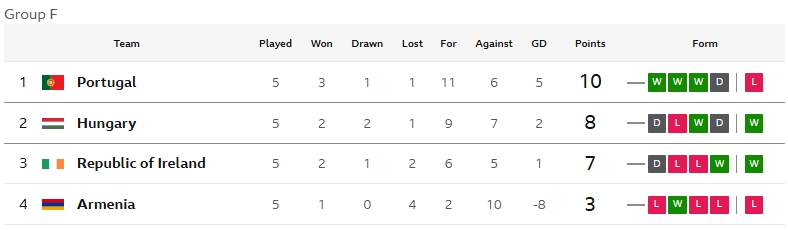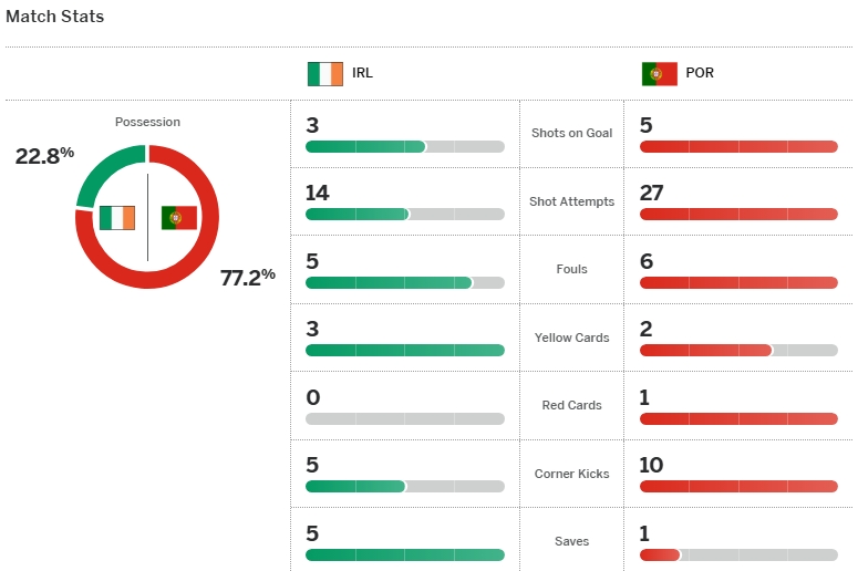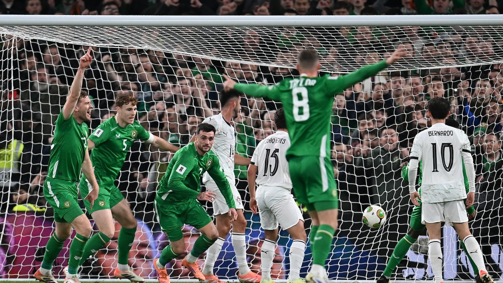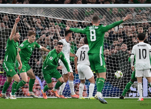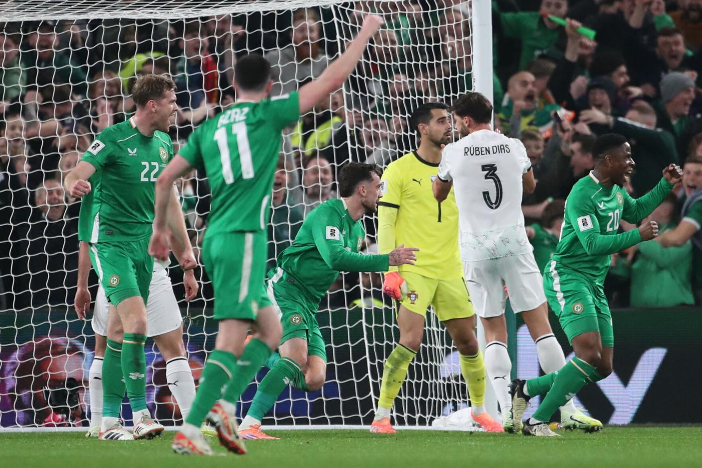 ไอร์แลนด์ โชว์ฟอร์มอย่างยอดเยี่ยม เกมรับที่เหนียวแน่นบวกเกมรุกที่เฉียบคม ได้ ทรอย แพร์รอตต์ เหมาคนเดียวสองประตู ในเกมที่ โปรตุเกส ต้องมาเหลือผู้เล่นเพียง 10 คน หลัง VAR อัพเกรดใบเหลืองของ คริสติอาโน่ โรนัลโด้ เป็นใบแดงโดยตรงในครึ่งหลัง จบเกม “ยักษ์เขียว” เอาชนะ 2-0 ทำให้พวกเขายังมีลุ้นเล็ก ๆ ในการคว้าตั๋วไปฟุตบอลโลก ส่วน “ฝอยทอง” ยังไม่การันตีตั๋วอัตโนมัติ แต่เจองานง่ายหน่อยในนัดสุดท้าย