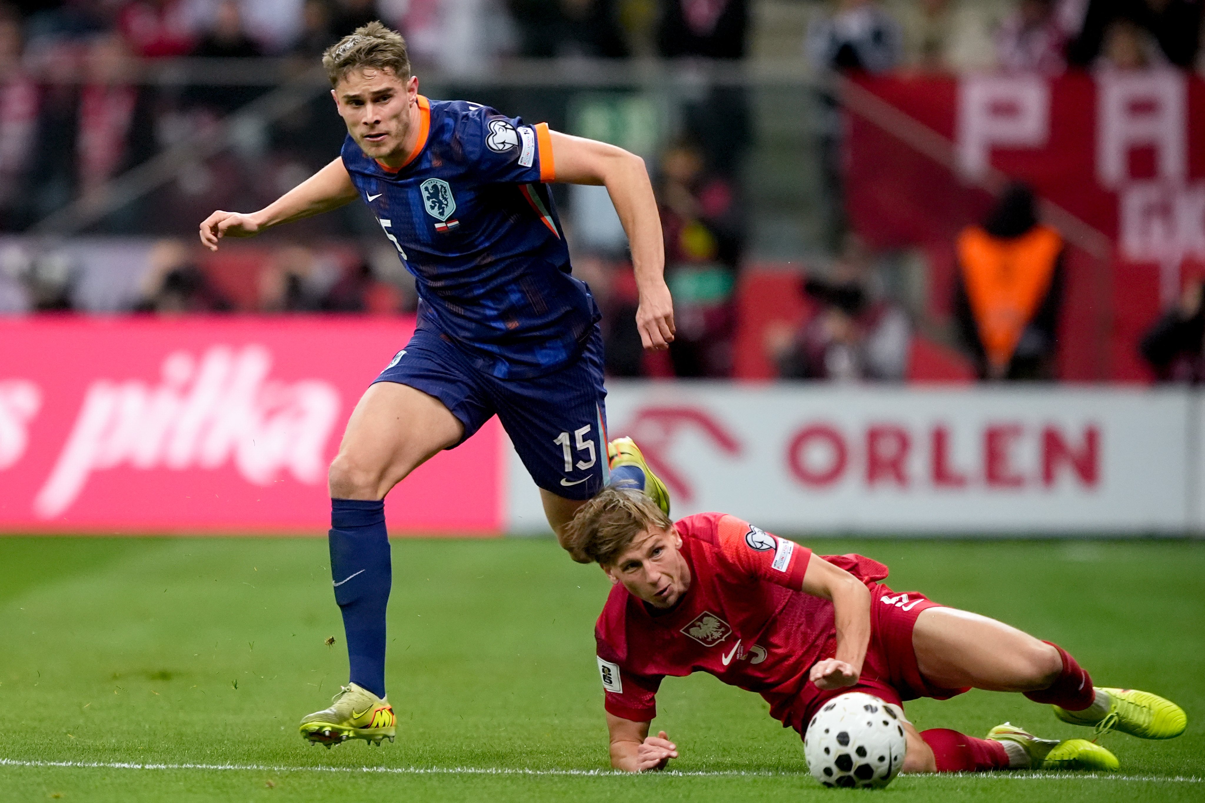 เนเธอร์แลนด์ ต้องการชัยชนะเพื่อการันตีตั๋วอัตโนมัติลุยศึกฟุตบอลโลกปีหน้า แต่พวกเขาต้องเป็นฝ่ายตามหลังก่อน เมื่อ ยาคุบ คามินสกี้ ซัดเบิกร่องให้ โปแลนด์ ออกนำนาทีที่ 43 อย่างไรก็ตาม เมมฟิส เดปาย มาซัดตีเสมอได้ในนาที 47 จบเกมเลยเสมอกันไป 1-1 ต้องไปลุ้นกันต่อเกมสุดท้าย แต่ลูกทีมของ โรนัลด์ คูมัน โอกาสซิวแชมป์กลุ่มแทบจะแบเบอร์