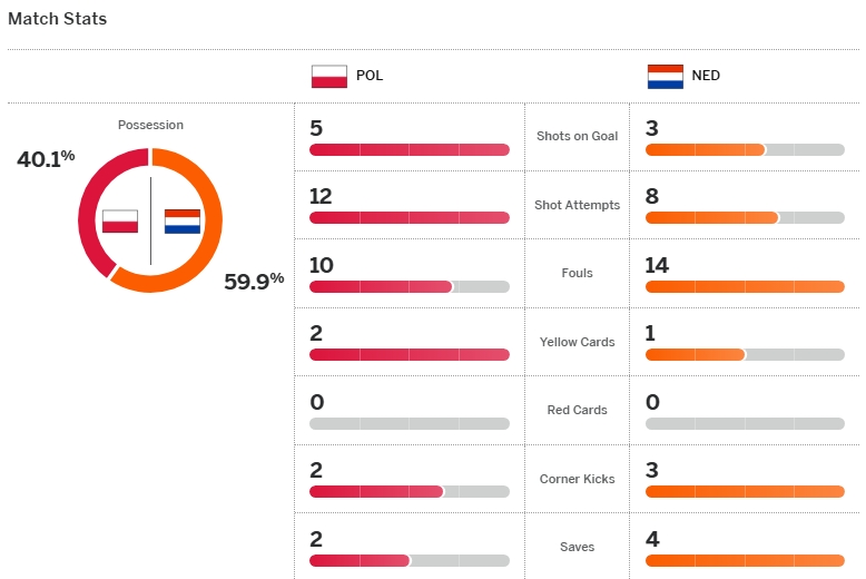 เนเธอร์แลนด์ ครองบอลมากกว่า แต่เป็น โปแลนด์ ที่จบสกอร์เยอะกว่า คามินสกี้ ได้บอลแล้วตัดเข้าในก่อนซัดเข้าซอง แฟร์บรุคเค่น