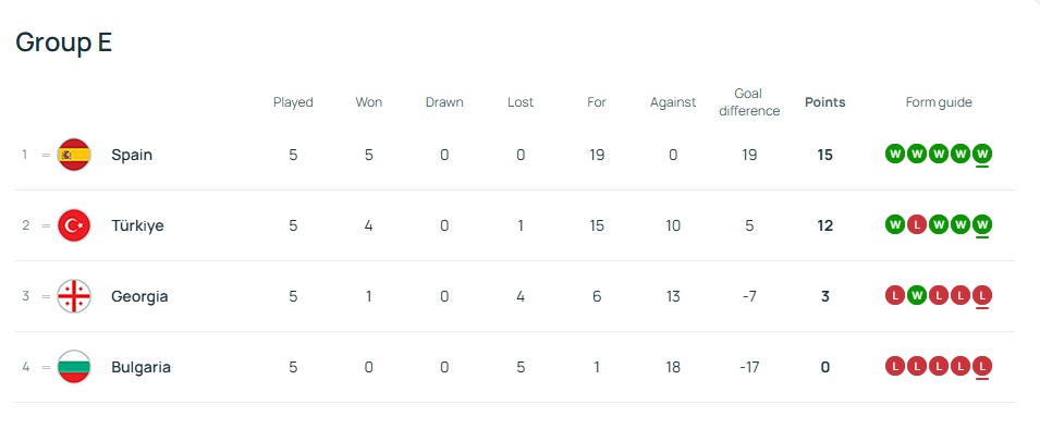 กระทิงดุ สเปน การันตีจบ 2 อันแรกของกลุ่มอีแน่นอนแล้ว โดยเกมนี้พวกเขาจะผ่านเข้ารอบสุดท้ายทันทีถ้าชนะจอร์เจีย และตุรกีไม่ชนะบัลแกเรีย หรือถ้าเสมอและตุรกีแพ้