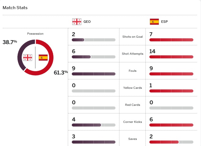 จอร์เจีย ยกระดับเกมขึ้นมาสร้างอันตรายให้แนวรับสเปนมากขึ้นกว่าในช่วงแรก อย่างไรก็ตาม พวกเขายังไม่เด็ดขาดพอจะตีไข่แตกไล่ขึ้นมา