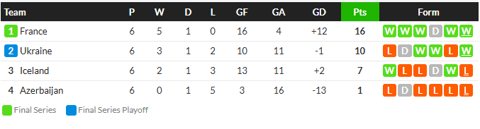 ฝรั่งเศส คว้าตั๋วบอลโลกไปแล้วจัดชุดโรเตชั่น โดนนำตั้งแต่ 4 นาที ทว่าไม่นาน ฌอง-ฟิลลิปป์ มาเตต้า โขกตีเสมอ แล้วเป็น มักเนส อากลิอูช แนวรุกพลังหนุ่ม เปิดซิงประตูแรกกับทีมชาติพลิกแซง ก่อนได้จังหวะเข้าโกล์ตัวเองของคู่แข่งปิดกล่อง บุกชนะ อาเซอร์ไบจาน 3-1 ปิดฉากรอบคัดเลือกสวยงาม