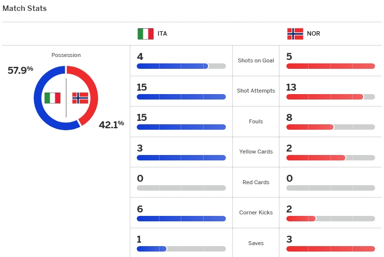 นอร์เวย์ ทำสถิติไร้พ่ายในรอบคัดเลือก แม้โดน อิตาลี ยิงนำก่อนจาก ฟรานเชสโก้ ปิโอ เอสโปซิโต้ ในครึ่งแรก แต่ครึ่งหลังเป็นหนังคนละม้วนเลย อันโตนิโอ นูซ่า ซัดตีเสมอ จากนั้น เออร์ลิ่ง ฮาลันด์ เหมาคนเดียวสองตุง และปิดกล่องด้วย ยอร์เก้น สแตรนด์ ลาร์เซ่น ให้ผู้มาเยือนพลิกแซงชนะ 4-1 พร้อมตีตั๋วไปฟุตบอลโลกอัตโนมัติ ส่ง อิตาลี ไปลุ้นเพลย์ออฟแทน